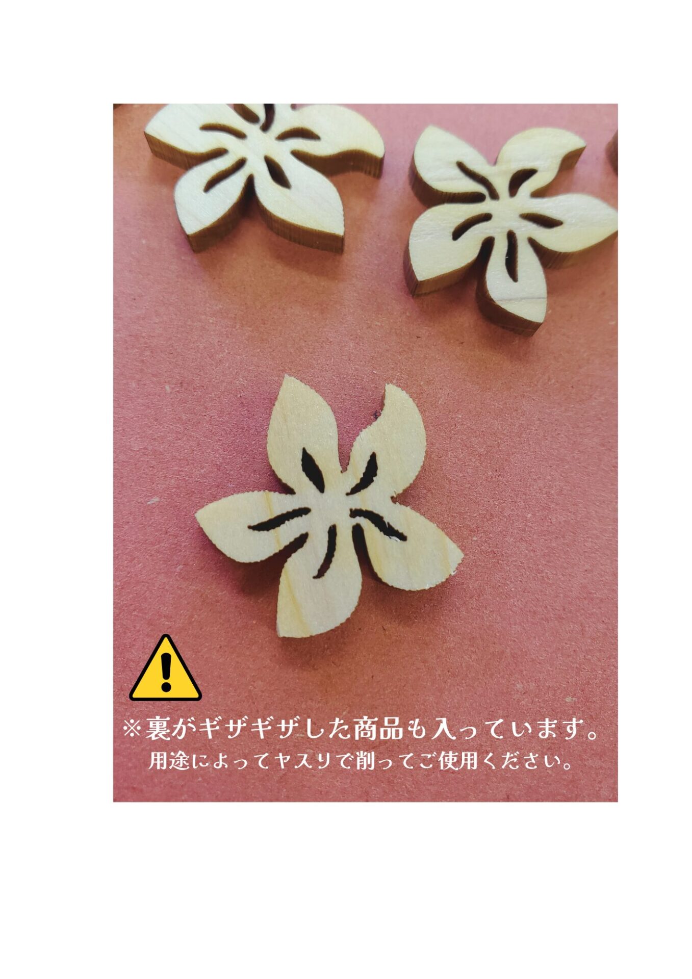 レーザー加工で仕上げているため、木の個性によって色味や形に少しずつ違いがあり、一部にギザギザとした断面のものが含まれることがあります。必要に応じて、紙やすりなどで優しく整えてくださいね。